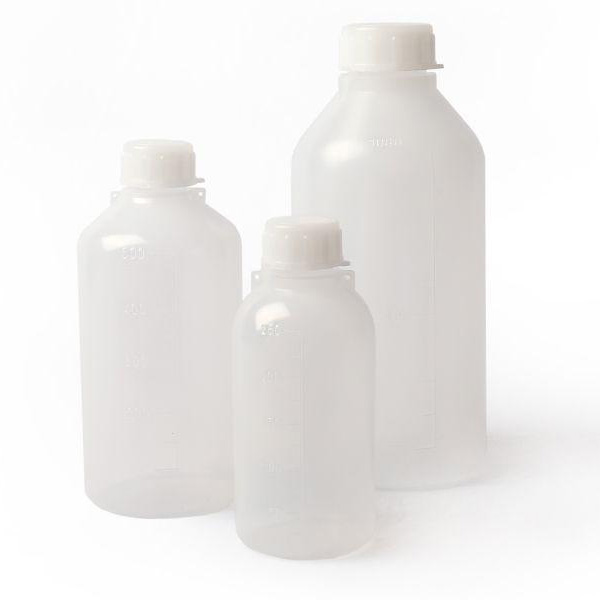 Fľaša guľatá úzkohrdlá, PE, so skrutkovacím uzáverom, rôzne objemy, 1 ks